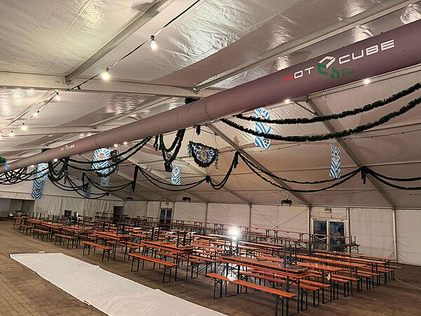 Die Kombination aus EventCube und HOT CUBE® Textilschlauch sorgt für eine besonders effektive Eventbeheizung. Während die Heizquelle zuverlässig Wärme erzeugt, übernimmt der Textilschlauch die gleichmäßige Verteilung im Raum.